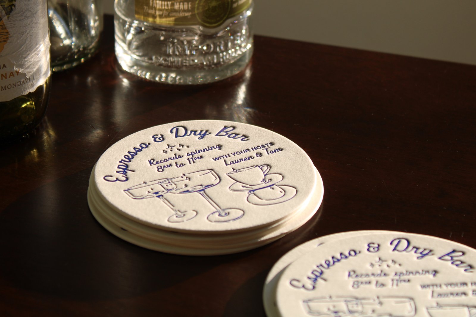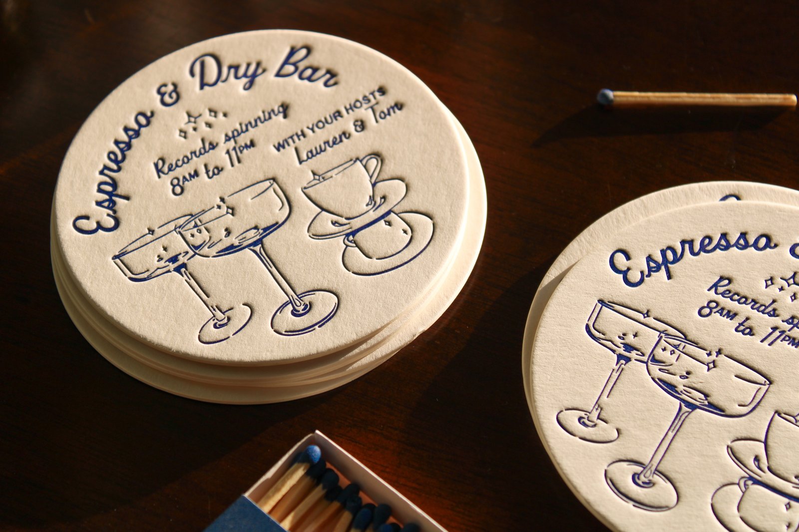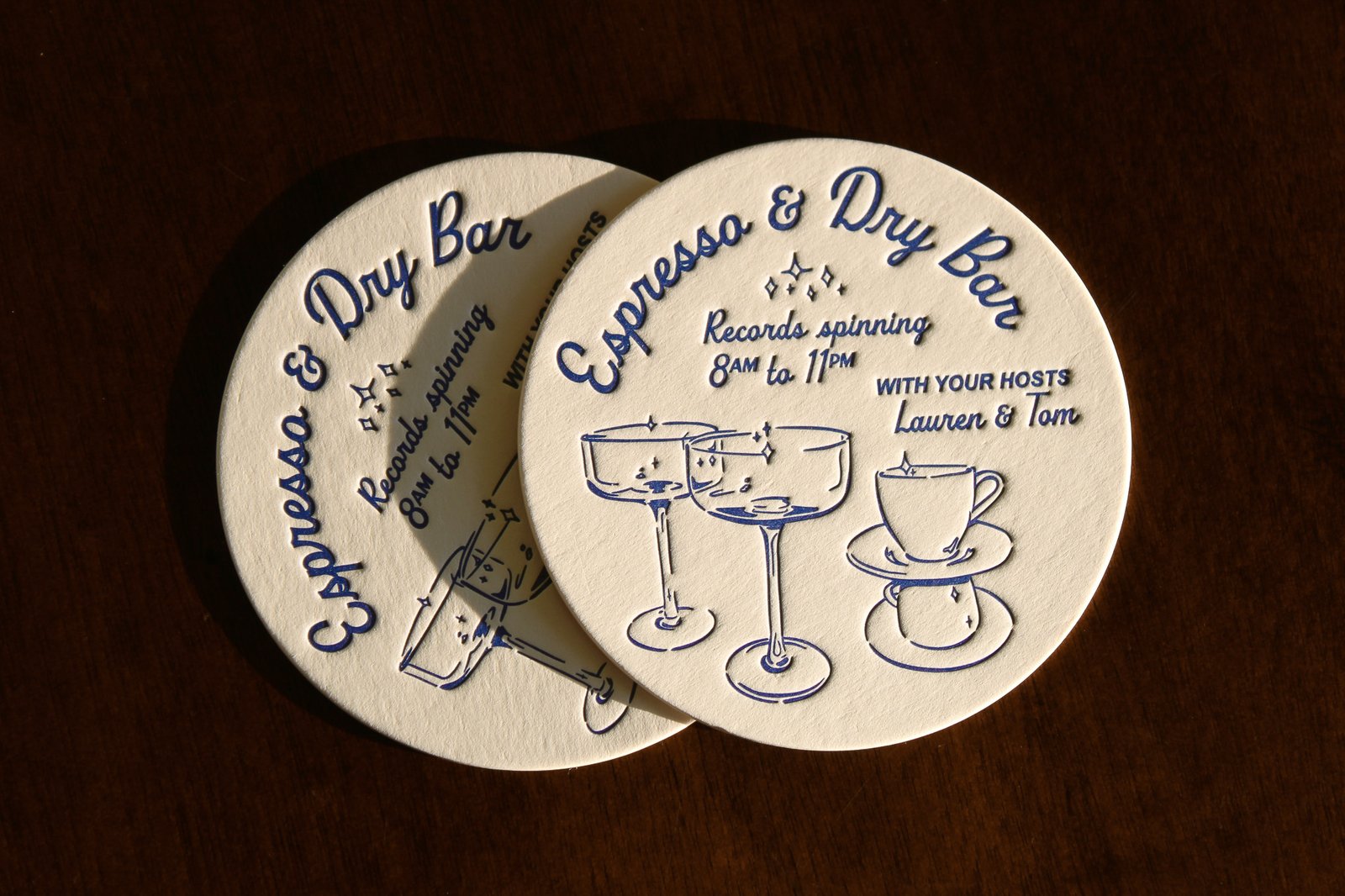Platen press printed coasters designed and printed by myself with photopolymer plates in a timeless royal blue. The type pairing is inspired that seen in mid-century promotional print material for bars such as cocktail napkins and matchboxes. The complementary illustrations were rendered in Procreate and translated into vectorized lines through Adobe Illustrator.