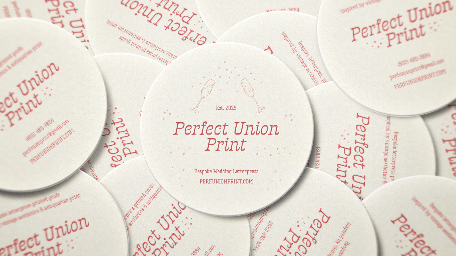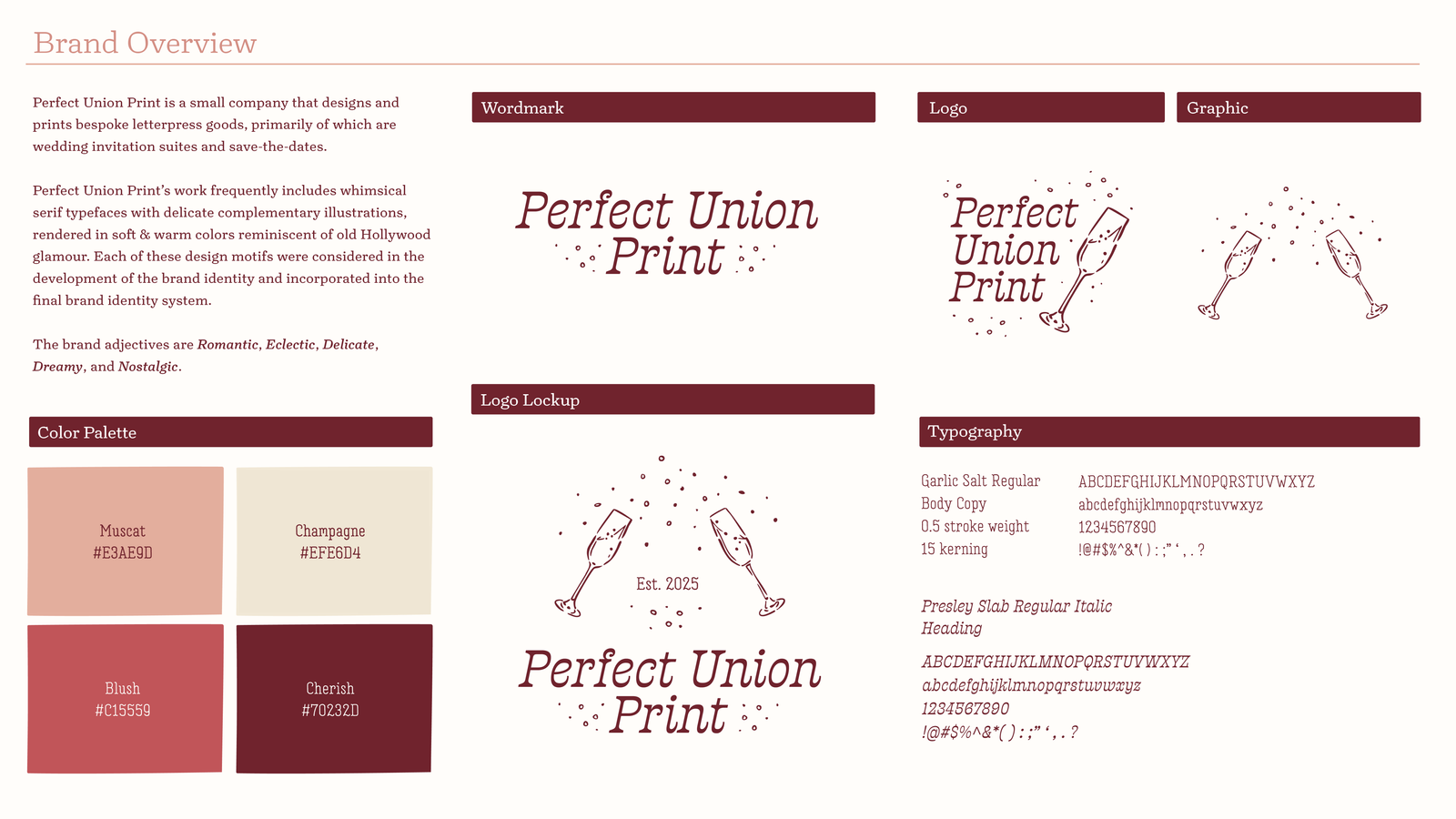 Soft, romantic shades of mauve and cream with romantic serifs and dainty illustrations establish Perfect Union Print as brand that draws upon Victorian design motifs and printmaking methods in marketing and production. Promotional materials reflect the high-end nature of the service and represent the quality of print or encourage the customer to represent the brand.